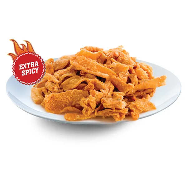 Seasoned and breaded chicken skin., Deep, fried until crispy and golden brown.